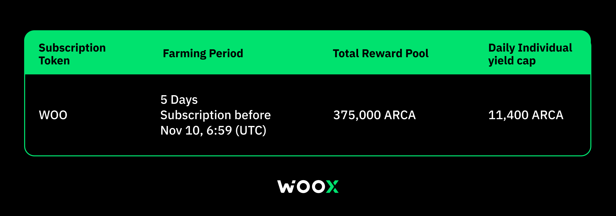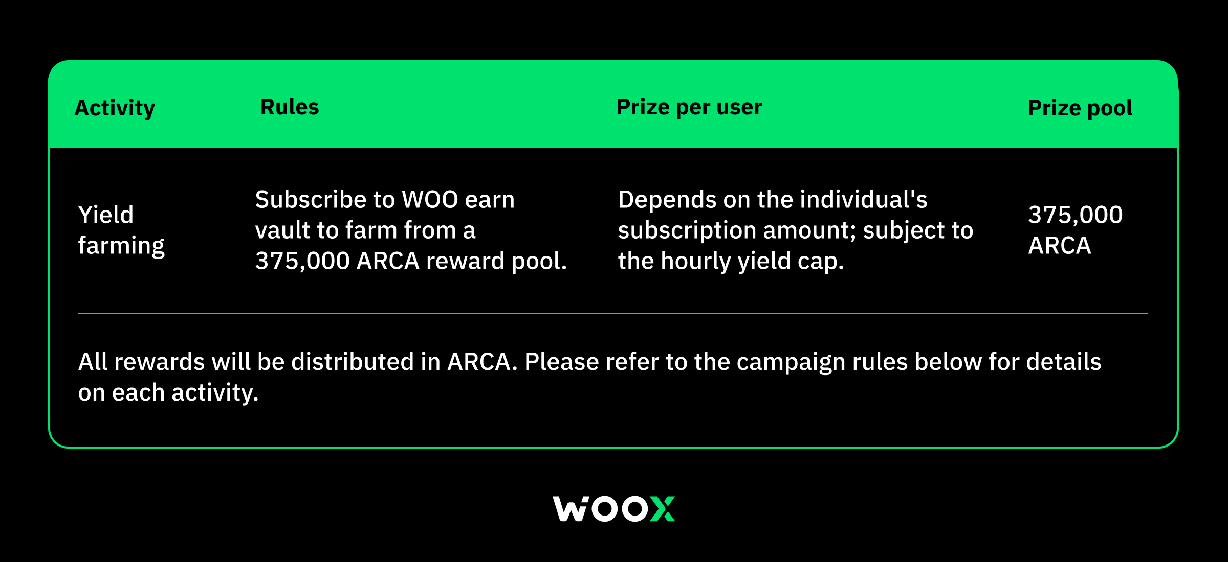 - Subscribe to ARCA yield farming vault with WOO to farm yields from a massive 375,000 ARCA prize pool. All yields will be distributed in ARCA.