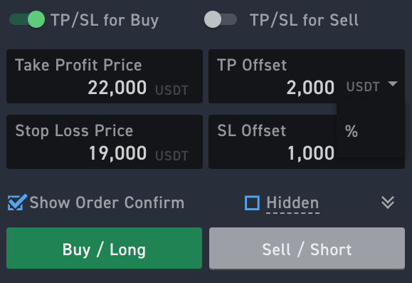 Step 2: Toggle on/off the ‘TP/SL for Buy’ and ‘TP/SL for Sell’ switches to enter your Bracket Order.