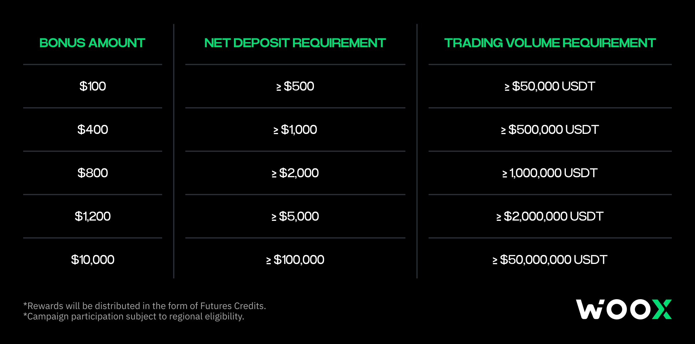 - 2B and KYB users are not eligible for this campaign. If you are a 2B or institutional user and wish to participate, please contact bd@woo.network for further assistance.
