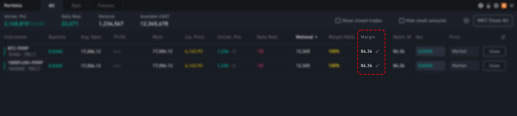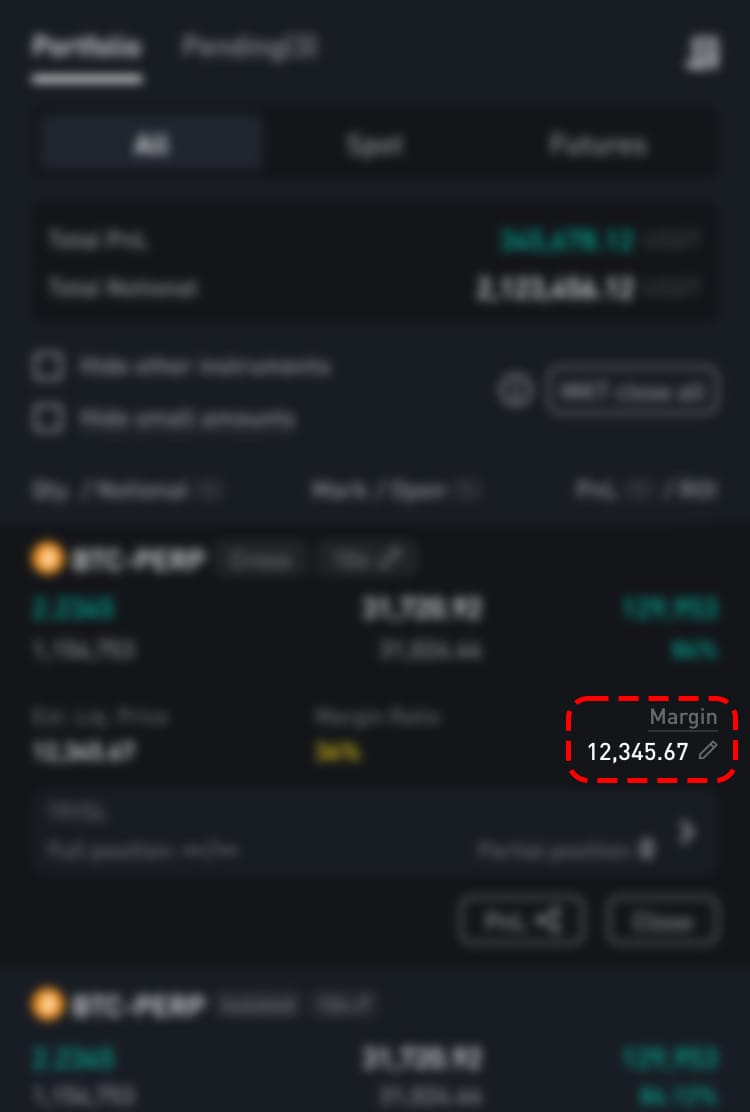 To adjust your margin, check the ‘Portfolio’ widget on desktop, or the ‘Portfolio’ tab on mobile. Look for the margin amount for your position, and click on the pencil icon to adjust the margin.