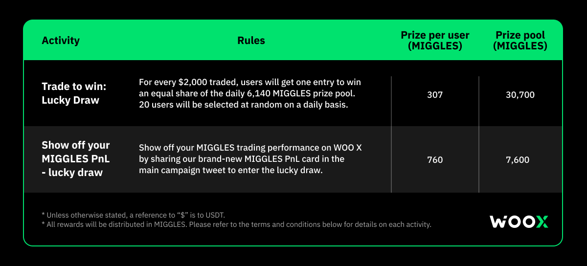 - Share your MIGGLES spot trade on WOO X by posting the brand-new MIGGLES PnL card on your X profile.