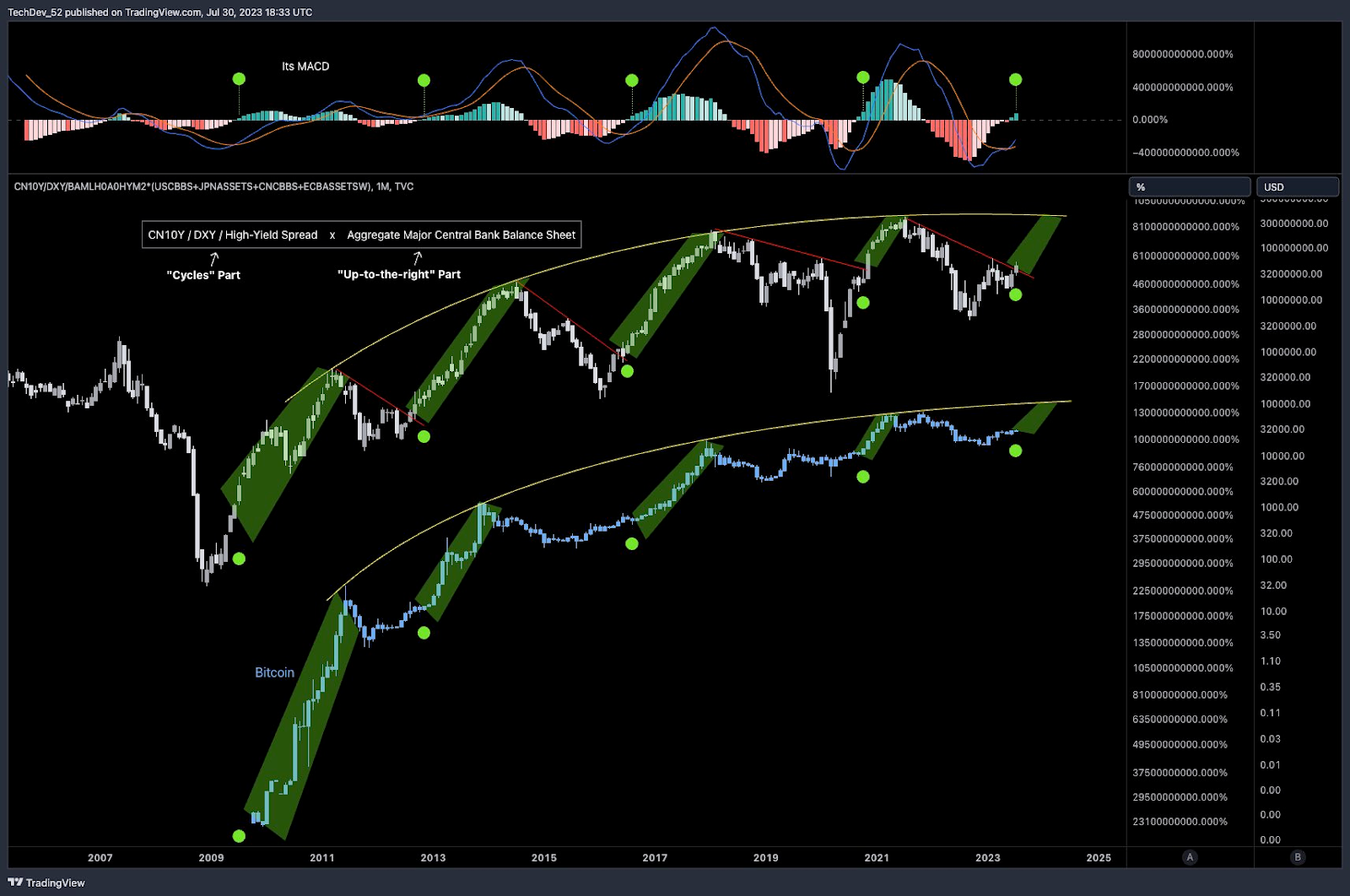 Twitter 用戶 TechDev_52 最近分享了一張圖表,進一步強調了流動性週期與比特幣之間的密切相關性。他使用債券殖利率、高收益利差和主要央行的資產負債表總額(即擴張或緊縮政策)在下圖中視覺化呈現流動性週期。