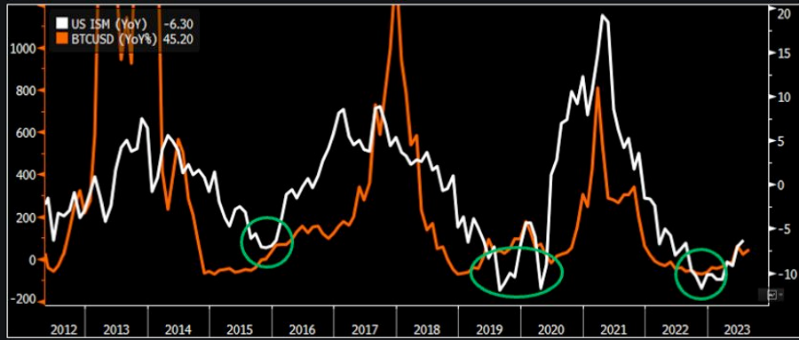 Delphi Digital 也透過繪製美國 ISM 製造業指數(白線),並將其與比特幣收益進行比較,展示了它與商業週期的相關性,進一步佐證我的觀點。正下圖所示,它們之間也存在很強的相關性。