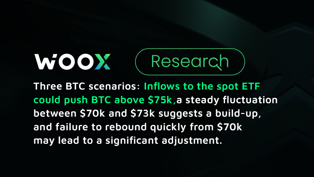 (2) If BTC fluctuates between $70,000 and $73,000, it could be a build-up period for major investors. Major players love to use sell-offs to test the buying power below as well as breakouts to test market trend-following orders and floating chips. It's crucial to keep track of indices, including the BTC futures-spot price difference, the capital rate, and the frequency of BTC transfers to exchanges.