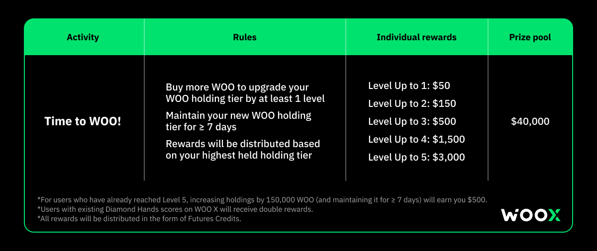 For a limited time only, upgrading your WOO holding tier could earn you a share of a $40,000 prize pool!