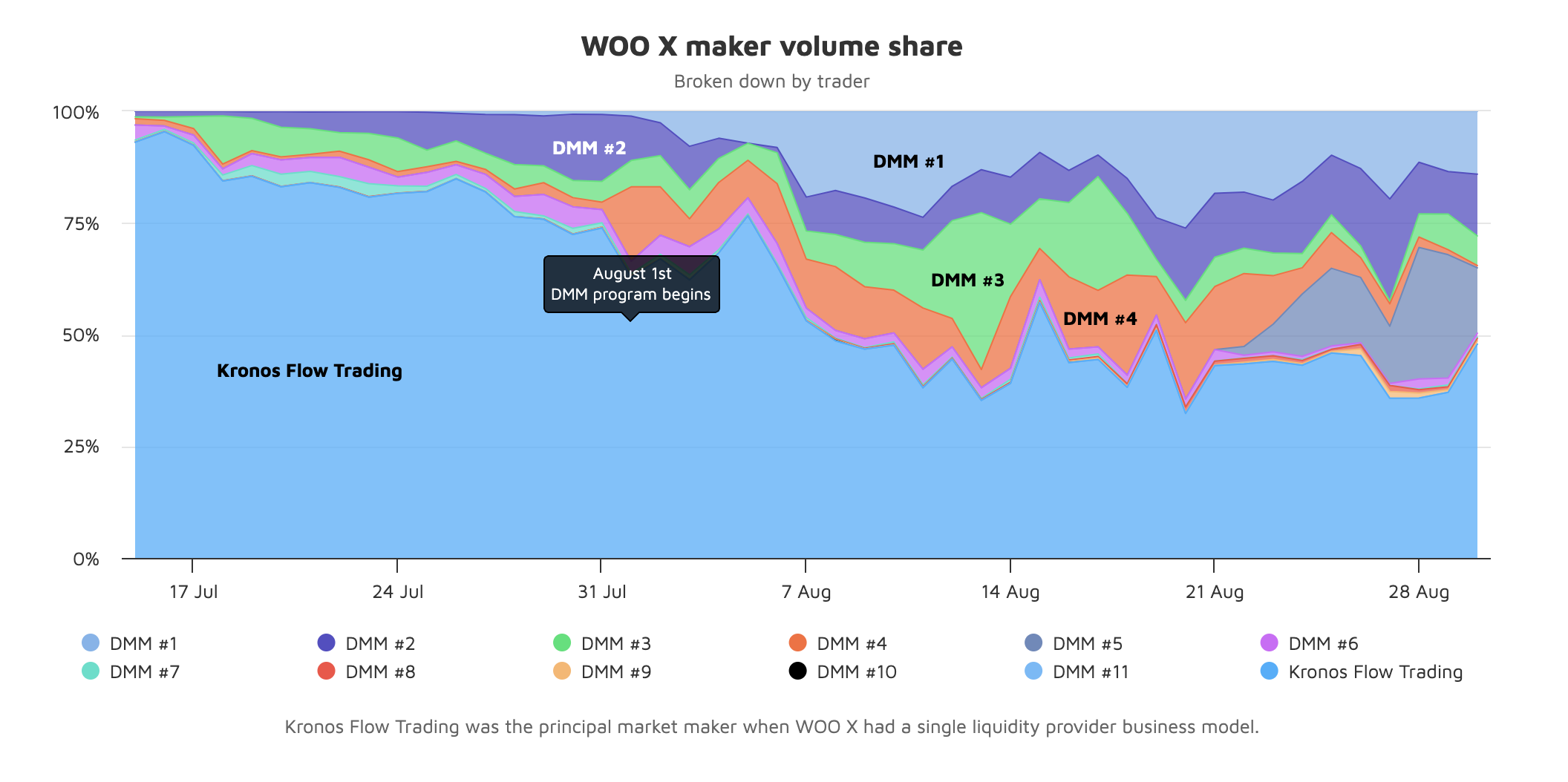 Above: Kronos Flow Trading was the old system of aggregating liquidity from other venues and providing in on WOO X. Since the first week of August (Epoch 1), market share has been steadily growing from other market makers.