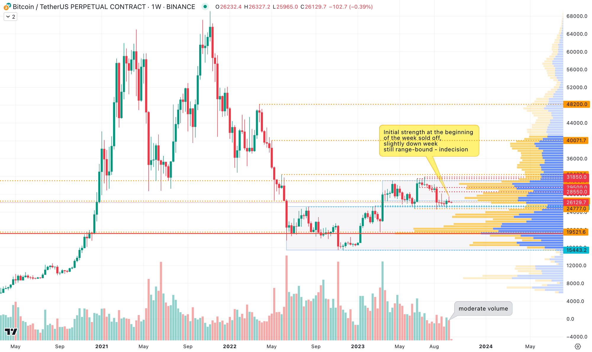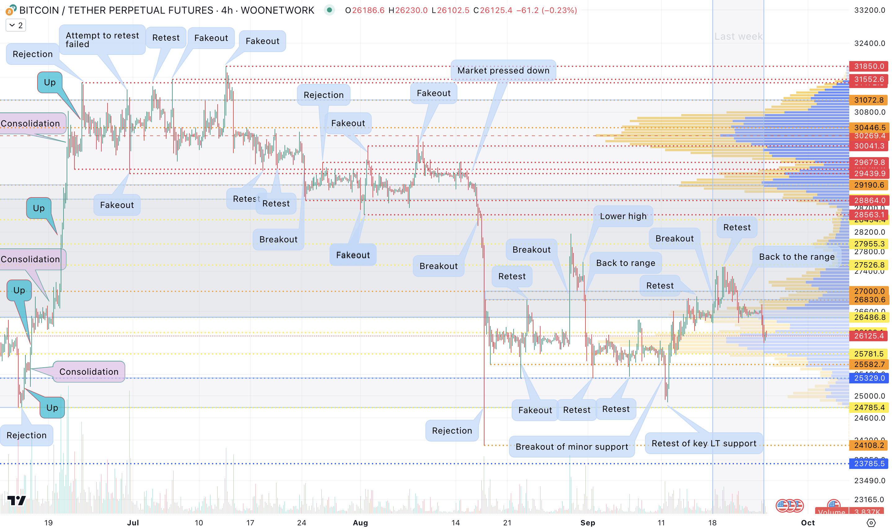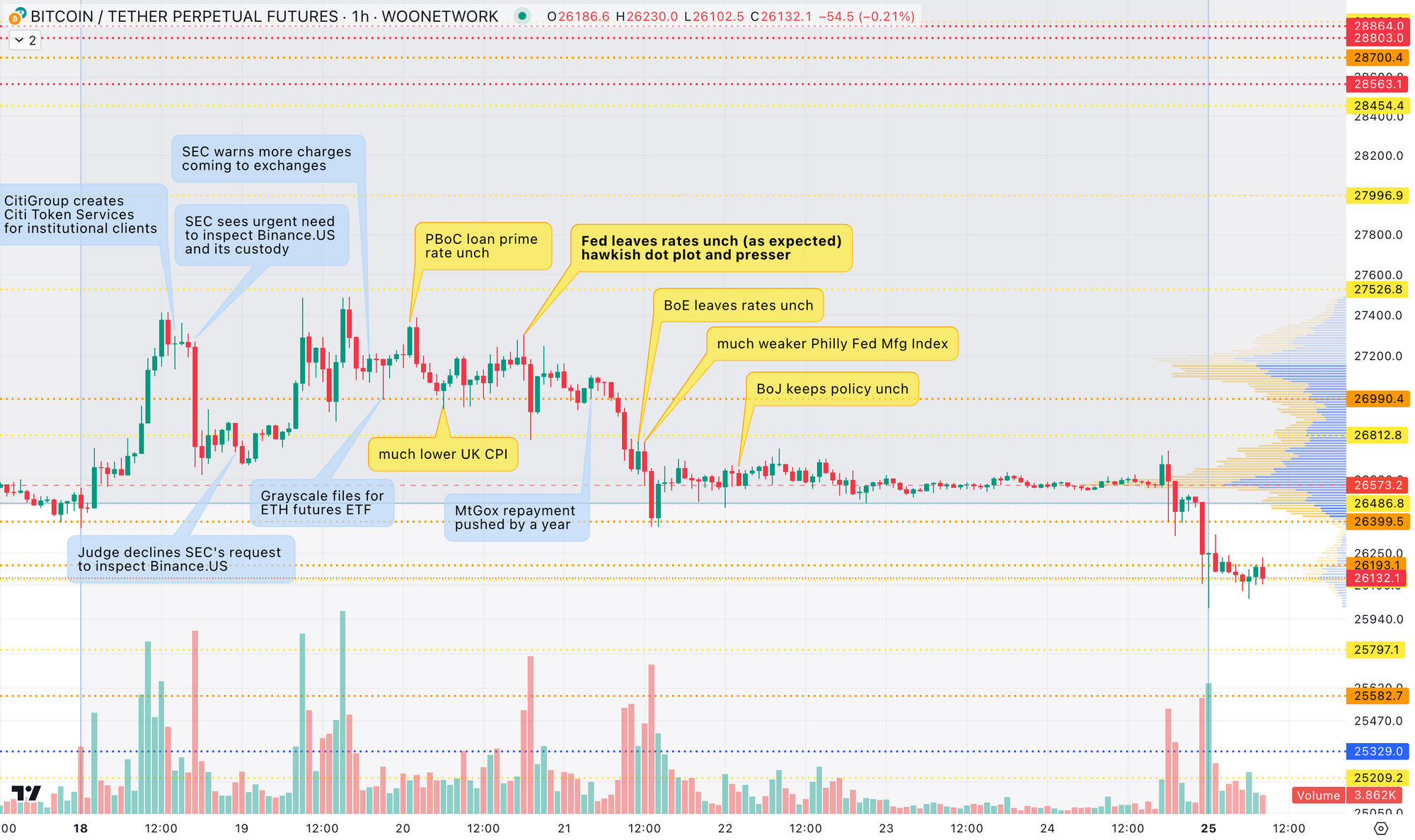 As the end of the week and open on Tradfi futures were approaching, activity started picking up and BTC sold off to print a new low of the week at $26,000.