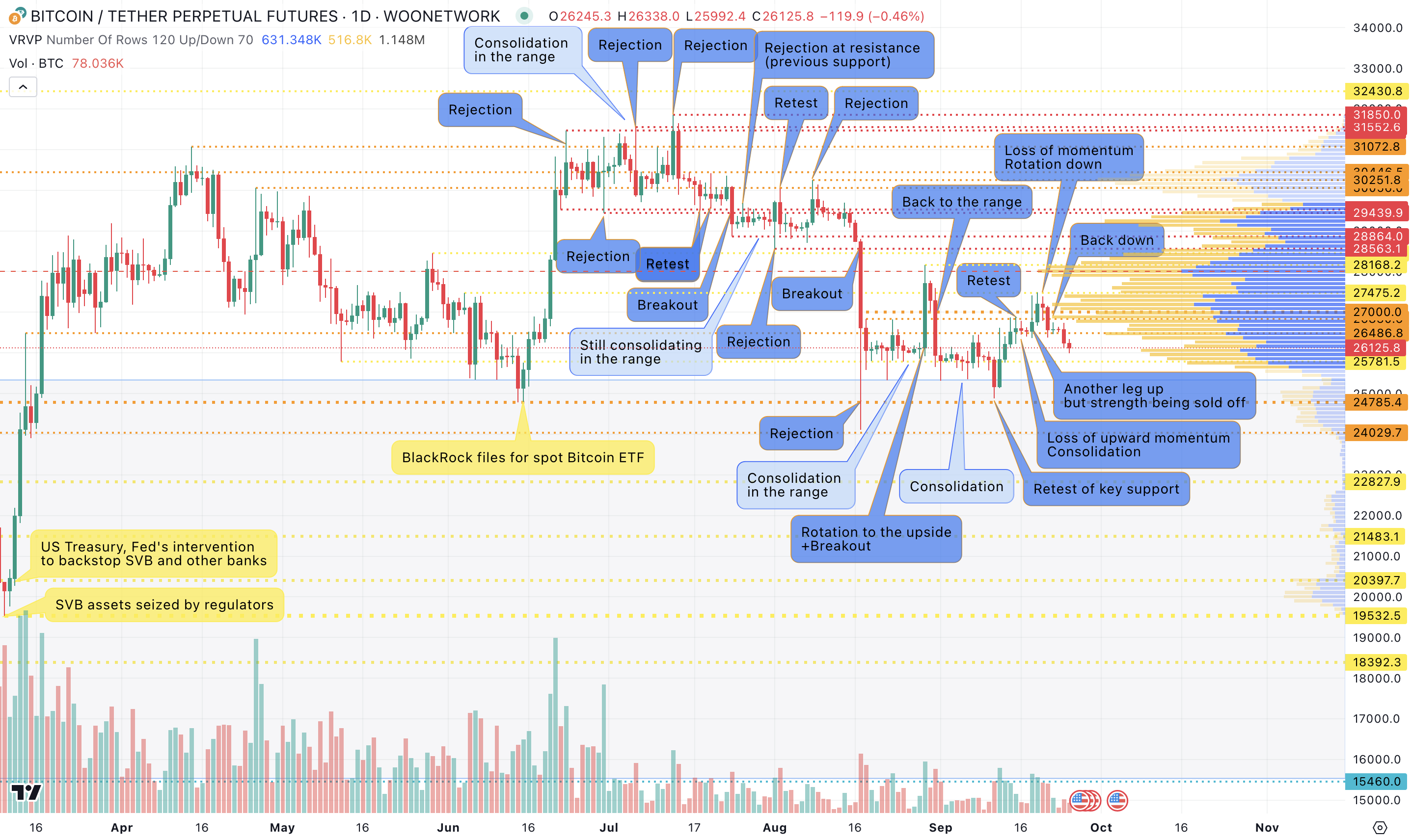 On Tuesday, we had another push to the upside, which was again perps-induced but $27,500 was strongly defended and momentum slowly changed to the downside.