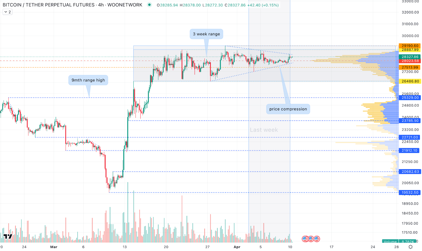 У наступні дні криптовалюта торгувалася у так званому боковику близько 28 тисяч доларів. При цьому ціновий рівень стискався дедалі більше.