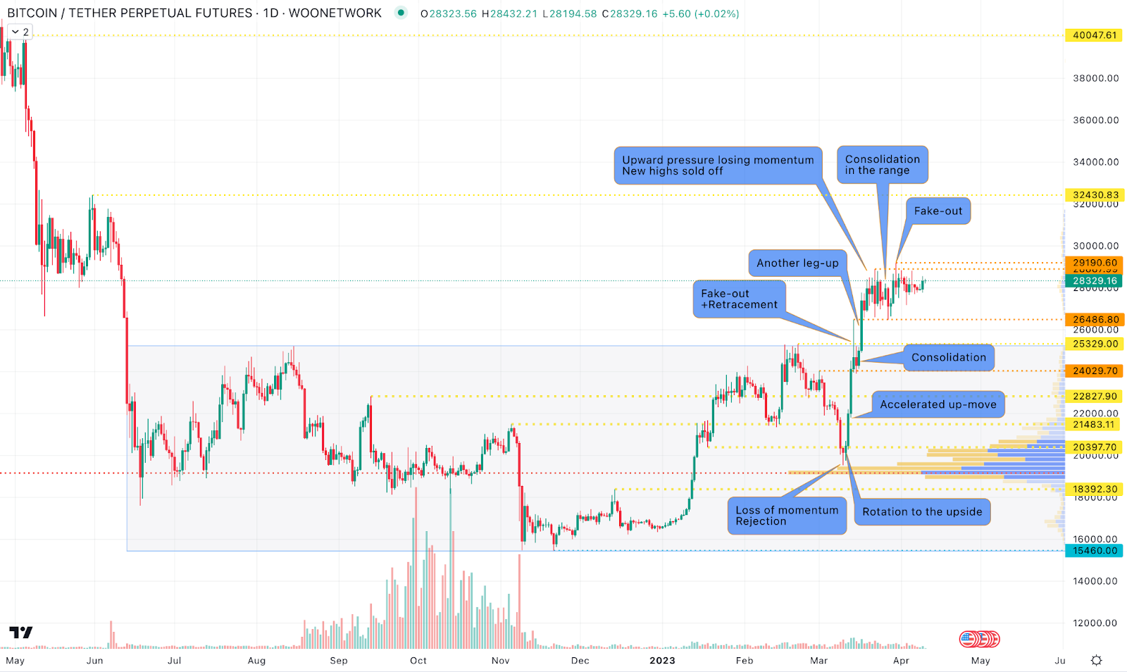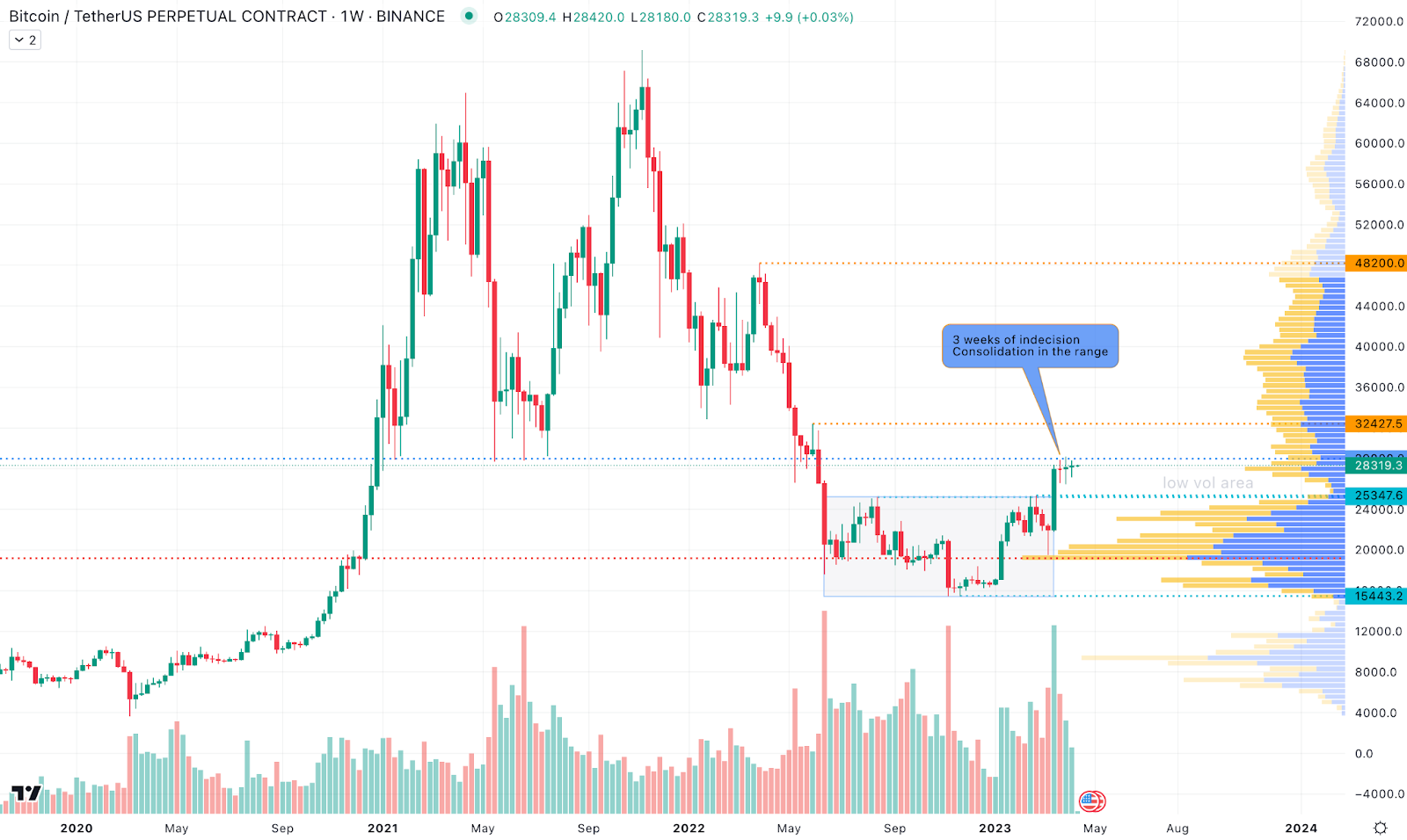 Рівень 28 тисяч доларів за BTC є важливою відміткою для трейдерів, які використовують стратегію повернення до середнього. На ньому спостерігається найбільший торговельний обсяг, тому саме ця позначка стане поворотною для ринку.