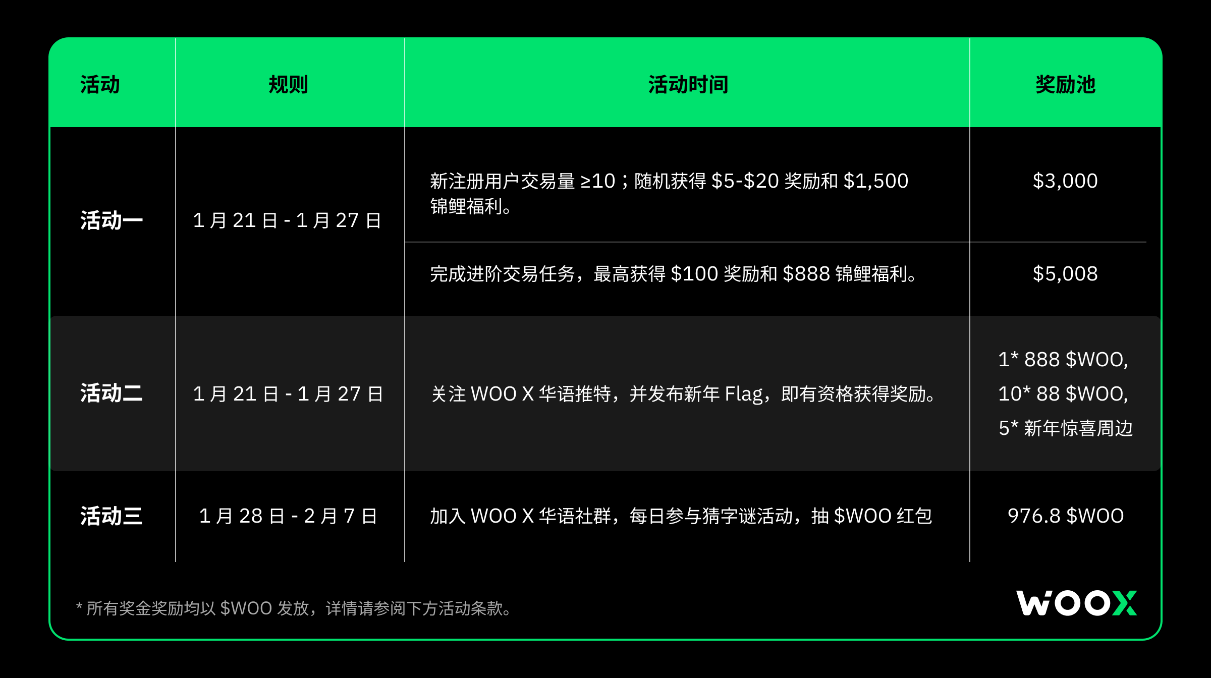 活动将随机抽取1位幸运用户获得888*WOO代币奖励;10位幸运用户每人获得88* WOO代币奖励;5位幸运用户获得新年惊喜周边奖励。