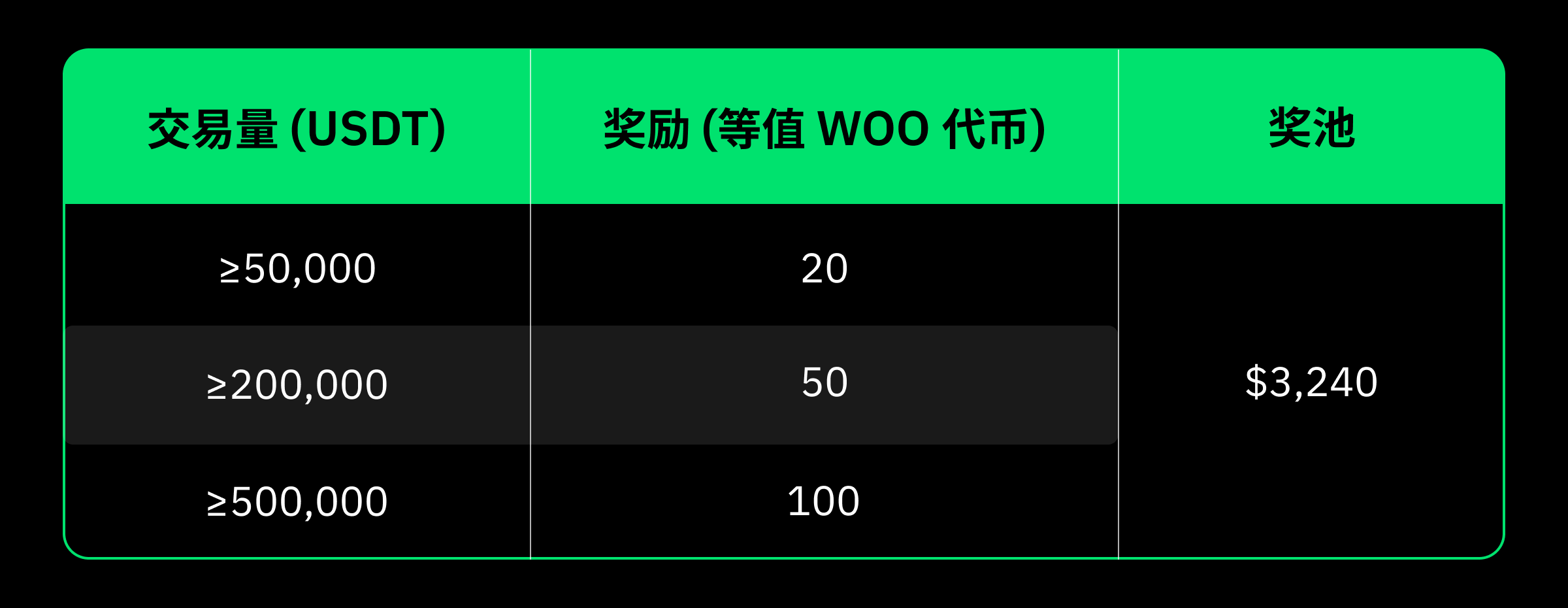 活动期间,新老用户完成指定交易量,即可领取WOO代币奖励,瓜分$3,240奖池: