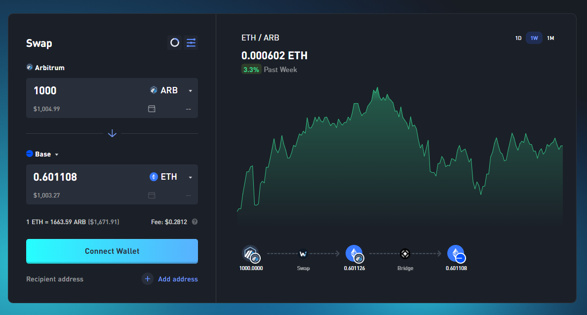 1. 你可以透過單筆交易,將七個網路上的多種資產跨鏈兌換成 Base 上的 ETH 或 USDC。此外,還可選擇將資金發送到不同的錢包地址,或甚至預備一些手續費(gas fee),如此一來,你在 Base 上便一切就緒。