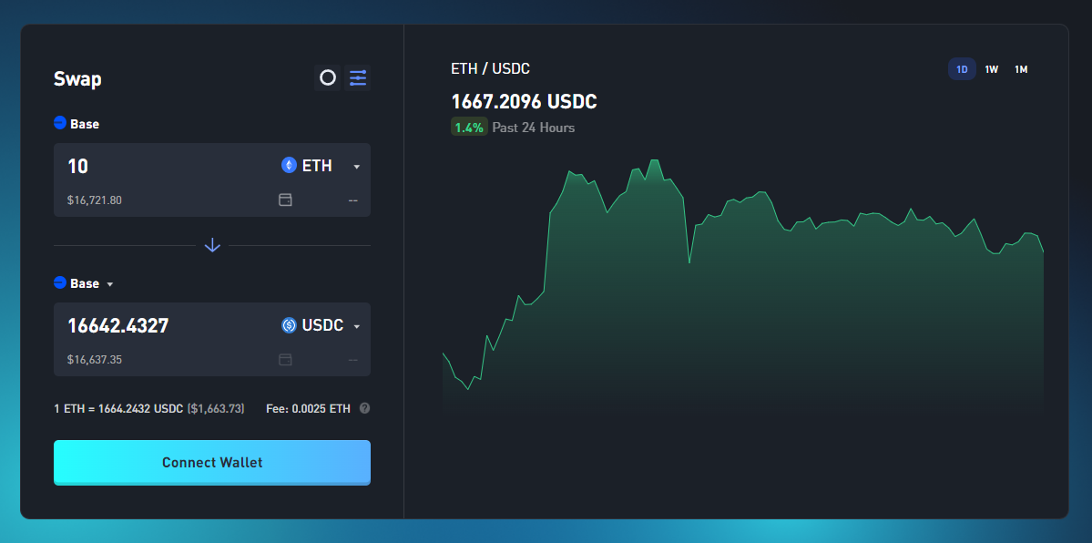 2. 你可以在 Base 上以具有競爭力的價格,進行 ETH 和 USDC 之間的兌換。與傳統 DEX 不同,WOOFi 從頂尖的中心化交易所取得流動性,確保用戶能享有始終如一、良好的交易執行能力。想了解 WOOFi 獨特模式的更多資訊,請查看這份文件。