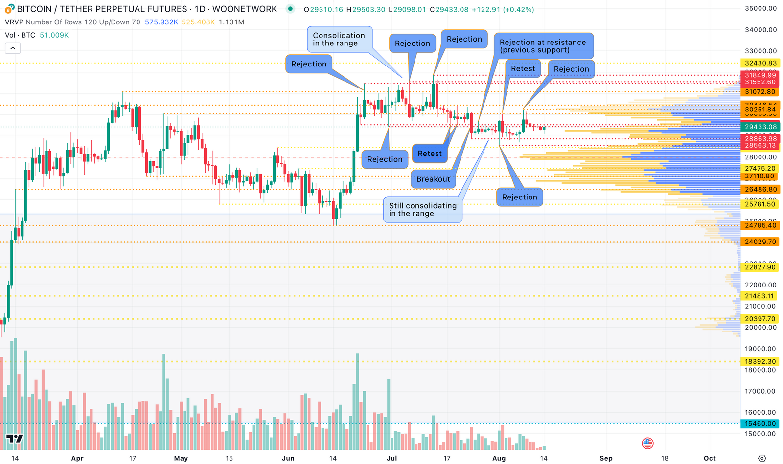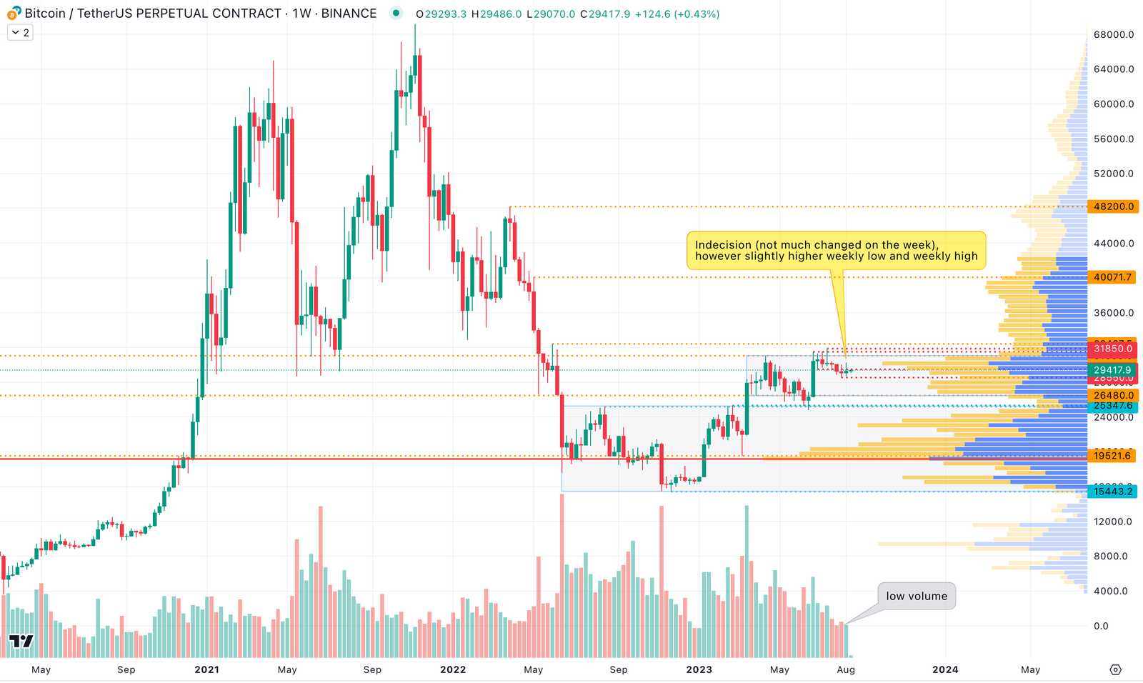 上週的 BTC 走勢並沒有發生太大的變化,我們仍然停留在 28500 - 30500 美元的區間內。然而,自 2023 年高點以來,這是第一個不僅有更高的週低點,也有更高的週高點的一週,對多頭來說是正面的。這是空頭失去動力、多頭試圖控制局面的跡象——至少目前是這樣。