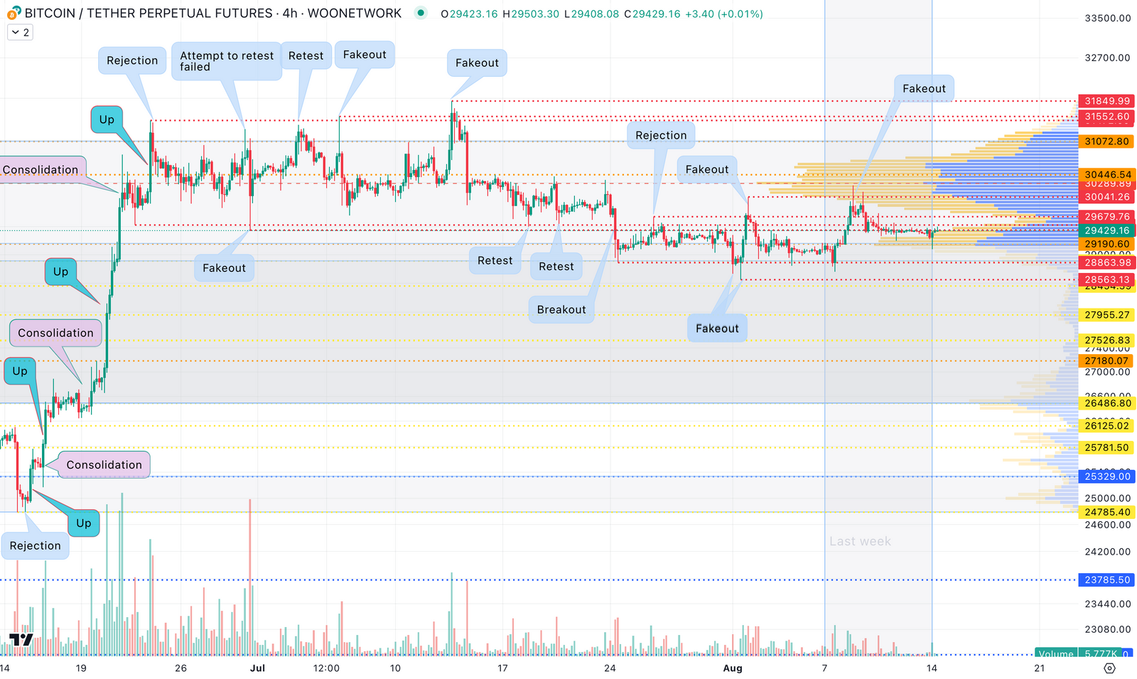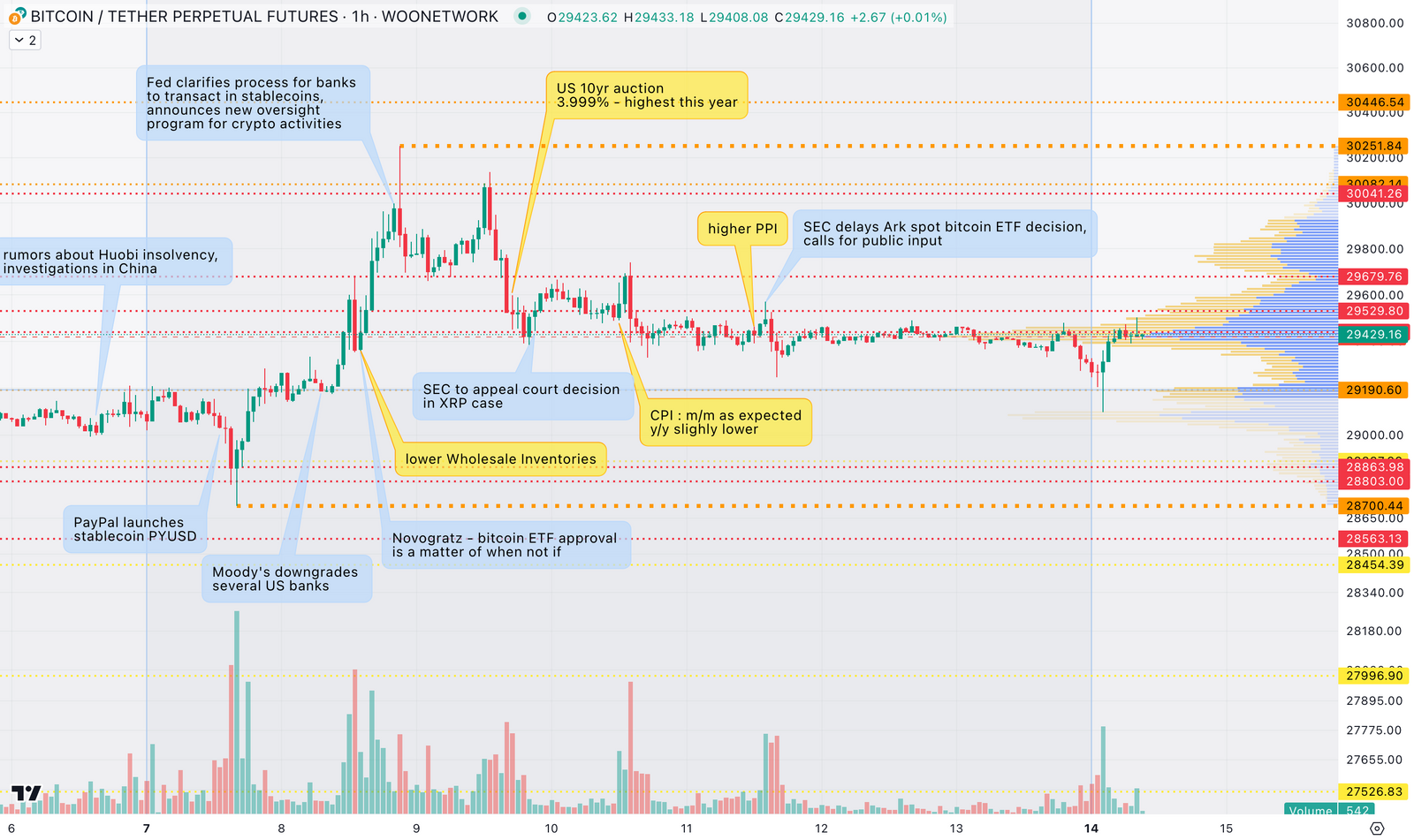 價格突破了上週的最高點,並在上方觸發了停損,將其推至 30,250 美元。但該流動性被吸收並有著強勢的壓迫。這與我們週一遇到的情況相同,只是這次是上行區間。此後,BTC 價格穩步下降,任何推高的嘗試都被更強烈地拋售,導致高點降低。