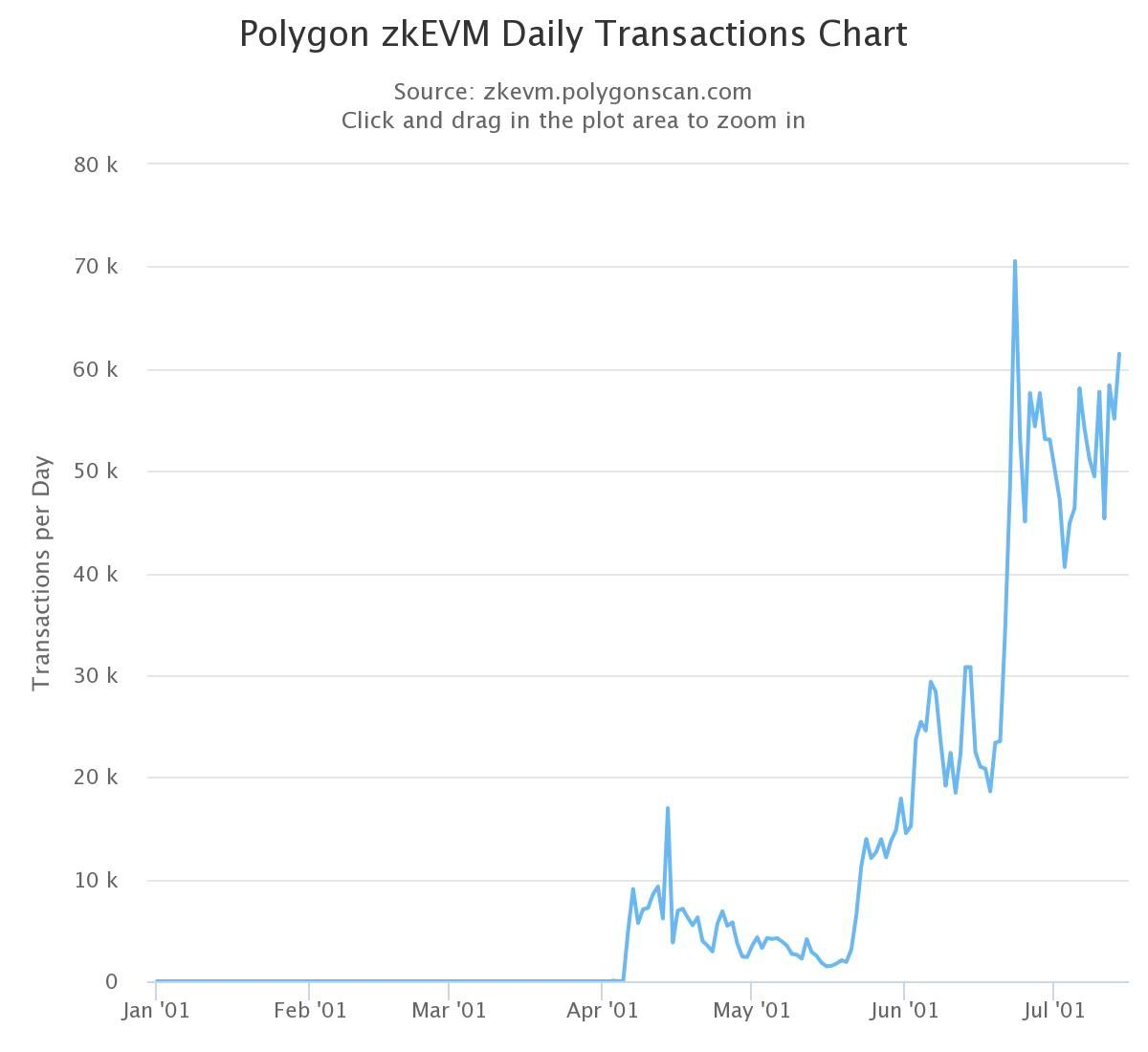 - 自 3 月 27 日主網 Beta 上線以來,Polygon zkEVM 展現出強勁機能性成長的跡象。它在 5 月份達到所有區塊鏈中最高的 TVL 成長,其每日交易量也在 6 月 13 日攀升至 70,543 筆的歷史新高。隨著時間推進、更多催化劑的出現,例如可望再降低手續費的 EIP-4844,用戶體驗只會越來越好,而我們正抓準趨勢、全速前進。